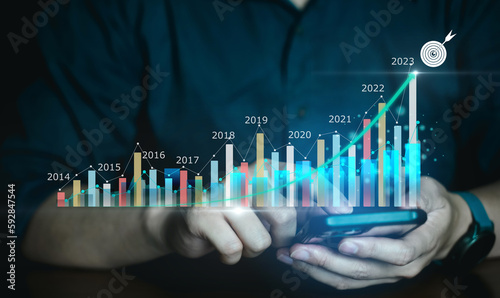 Businessman planning and business growth on desk with virtual screen. Calculate income and profit on investments and an increase in the indicators of positive growth.