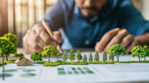 Businessman planning on environmental protection initiative for clean and sustainable future ecology, ESG environmental social governance display on paper chart on eco-friendly company