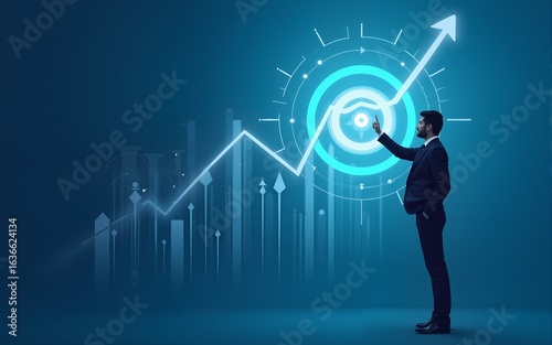Businessman pointing at digital target with arrow and growth arrows, symbolizing achieving goals and business success concept on blue background. High quality