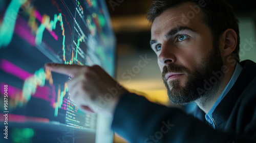 Businessman pointing at stock market trends on a computer screen modern portrait financial background analysis