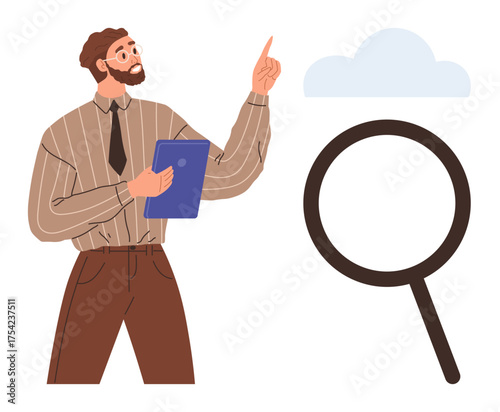 Businessman pointing to a cloud while holding a digital tablet beside an oversized magnifying glass. Ideal for technology, innovation, cloud computing, data analysis, education, research, teamwork