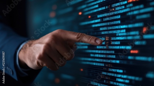 Businessman Points to Holographic Financial Data in a Futuristic Bank Setting with Encrypted Information Flowing Around