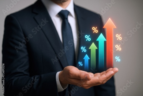 Businessman Presenting a Growth Chart with Ascending Arrows and Percentage Signs, Indicating Positive Financial Performance