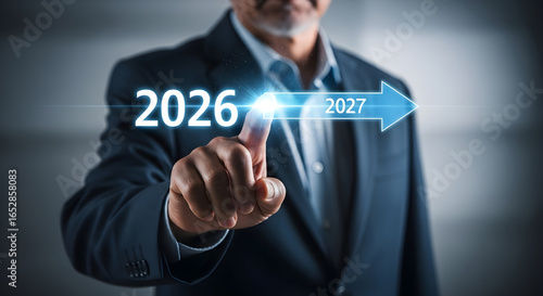 Businessman pressing a futuristic interface, advancing from "2026" to "2027." Concept of future planning, business foresight, next steps, and progress.