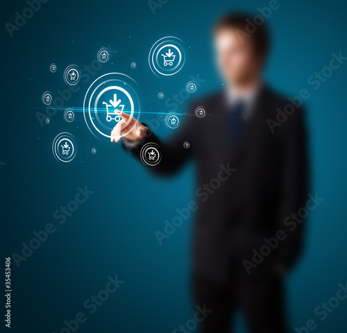 Businessman pressing virtual promotion and shipping type of icon
