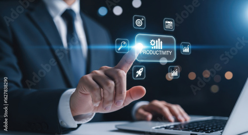 Businessman productivity technology digital innovation efficiency office success growth futuristic—Businessman using digital interface to increase productivity and efficiency modern office