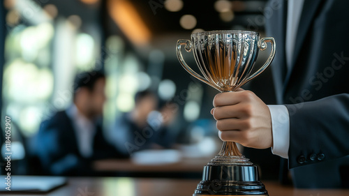 businessman proudly holds trophy, symbolizing teamwork and success in corporate environment. blurred background features colleagues engaged in discussion, highlighting achievement