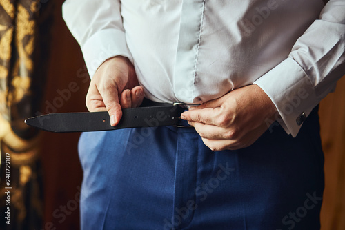 Businessman putting on a belt, fashion and clothing concept,groom getting ready in the morning before ceremony