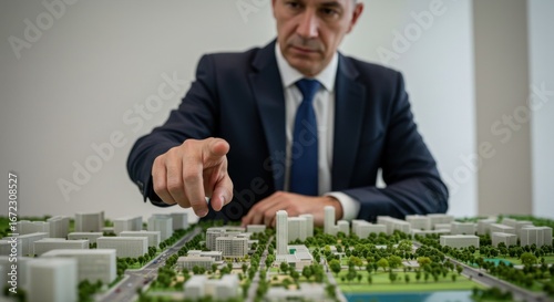 Businessman reviewing detailed architectural model, pointing at a specific area of the city plan.