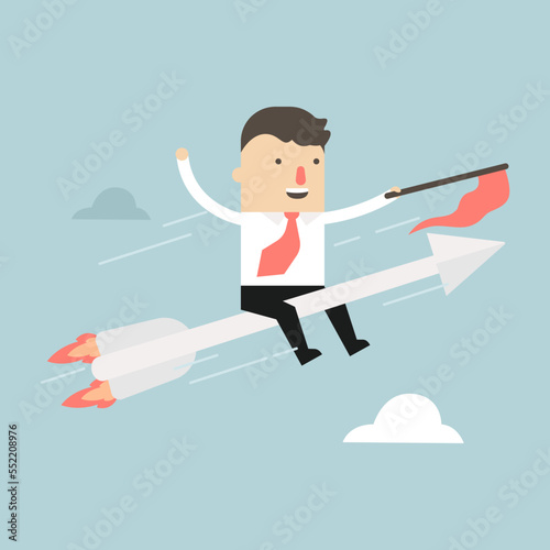 Businessman riding success arrow, install rocket.