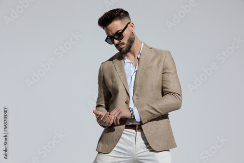 businessman rubbing his palms and looking down