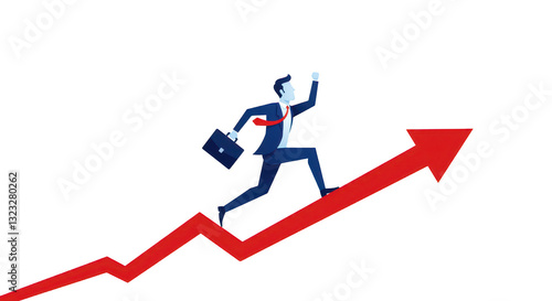 Businessman running along a red upward line, symbolizing success and determination, on a white background