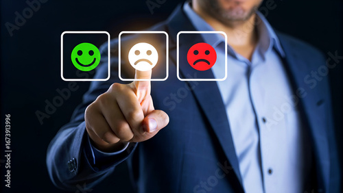 Businessman selecting a neutral feedback option on a digital interface, indicating average customer satisfaction with the service or product