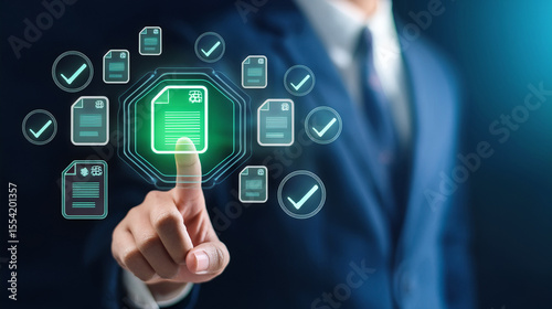 Businessman selects digital documents with approval check marks in a modern and efficient technology interface system