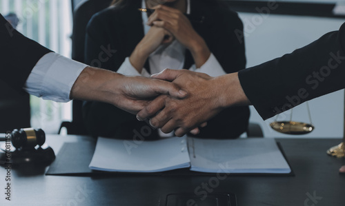 Businessman shaking hands to seal a deal with his partner lawyers or attorneys discussing a contract agreement