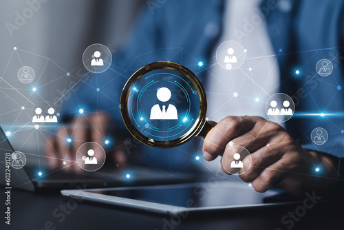 Businessman showing virtual graphic human icon HR human resources recruitment team Staff management business concept.