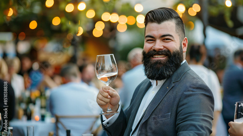 Businessman smiling while holding a glass of wine at an outdoor party