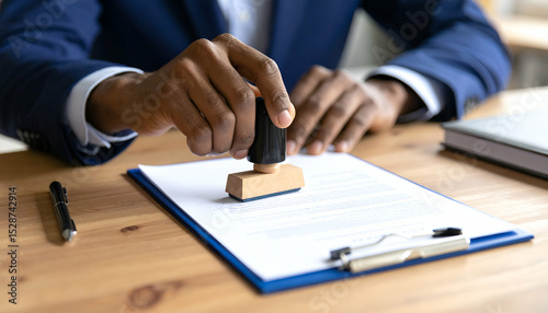 Businessman stamping official document Approval, authentication, and legal process