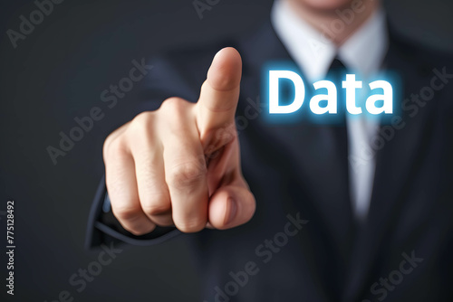 Businessman stand behind and pointing in to word “Data”, digital information in the online world or network technology