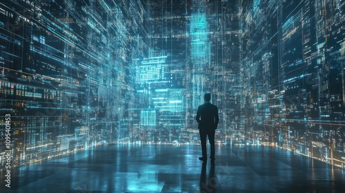 Businessman standing at the office, overlooking a panoramic city view. Digital cityscape and technology network background for future business growth and smart city