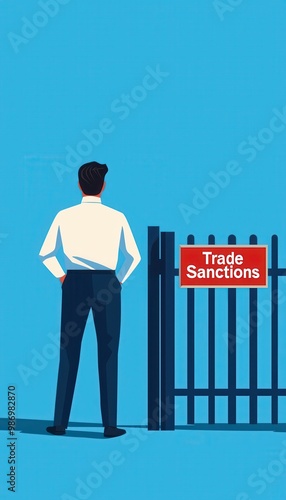 Businessman standing by a gate labeled Trade Sanctions against a blue background.