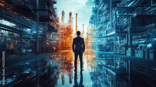 Businessman Standing in Front of Industrial Plant at Sunset Glow
