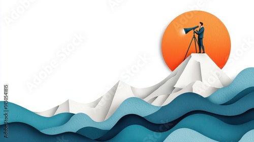 Businessman standing on mountain peak with telescope against large sun and waves illustrating ambition and vision