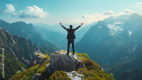 businessman standing on top of mountain with hands raised, success and achievement concept