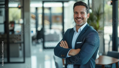 Businessman standing with arms crossed, smiling in a sleek office, captured in high-definition realistic style.
