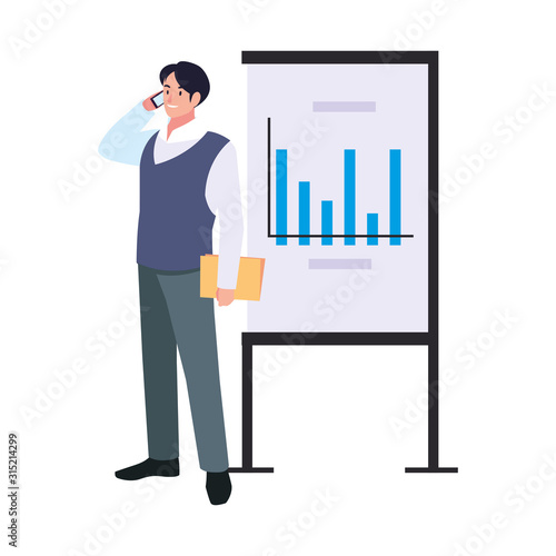 businessman standing with graphs on white background