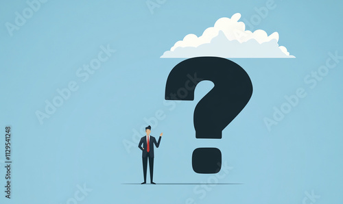 Businessman stands under a large question mark symbolizing uncertainty and decision-making in a blue sky setting