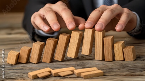 Businessman stops her hand blocking or falling dominoes Financial business and risk management Businessman prevents wooden blocks from falling with his hands