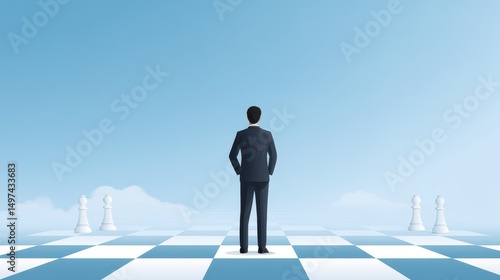 Businessman Strategist Planning Future on a Giant Chessboard Under a Clear Sky
