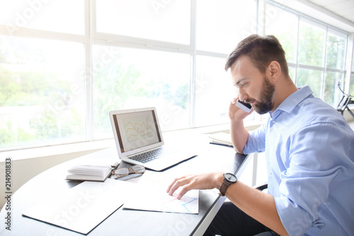 Businessman talking by phone while working in office