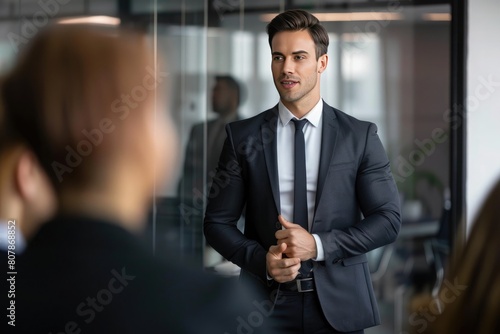 Businessman talking to colleagues during meeting in office. Business people having conversation at workplace. Teamwork concept
