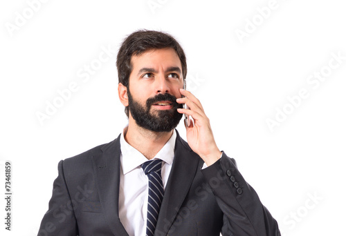 Businessman talking to mobile over white background