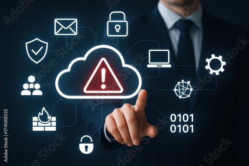 Businessman Touches Cloud Symbol with Warning Sign and Security Icons Representing Cybersecurity Concerns