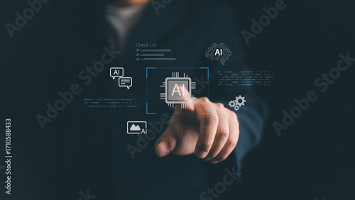 Businessman touching AI icon on virtual screen, symbolizing artificial intelligence, machine learning, digital technology, automation, innovation, and future data-driven business solutions.