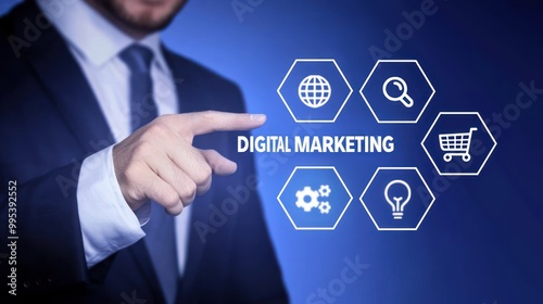 Businessman touching an icon representing digital strategy with the text DIGITAL MARKETING and related icons, symbolizing engagement, online business tactics, marketing innovation