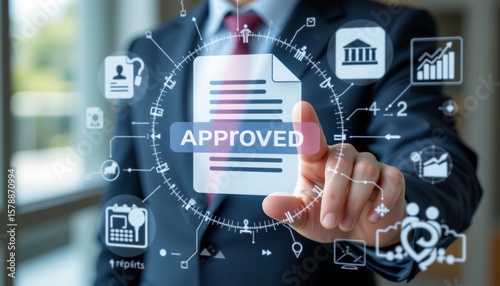 businessman touching approved document icon on digital documents for approve business project proposals. quality assurance and online evaluation of business concept.