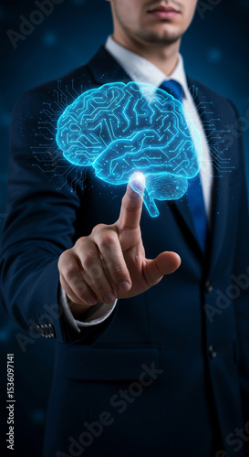 Businessman touching digital brain hologram. Concept of artificial intelligence, innovation, neural networks, and future technology in business and decision-making