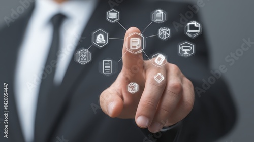 Businessman Touching Digital Interface of Document Management System with Icons and Symbols