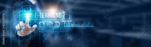 Businessman touching E-learning screen displaying network connection, data analysis, and online education resources and training. E-learning technology concept. Digital transformation in education.