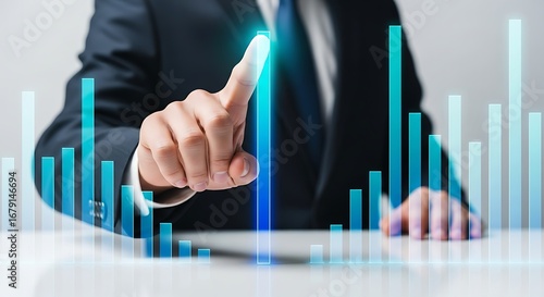 Businessman touching glowing digital financial chart with increasing bar graph and data analytics in futuristic business concept