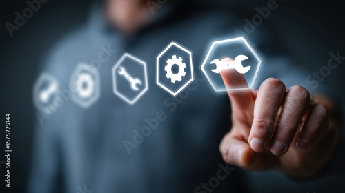 Businessman touching glowing digital icons representing maintenance and repair, futuristic interface with wrench and gear symbols.