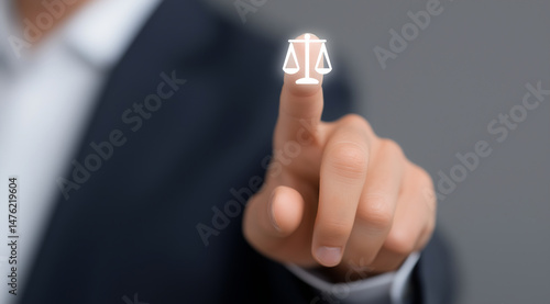 Businessman touching glowing digital scales of justice icon on a virtual screen, a concept for law or commerce in business activity and the pursuit of positive freedom from technol