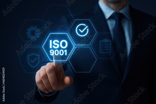 Businessman Touching ISO 9001 Certification Icon On Virtual Screen