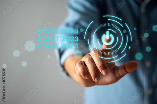 Businessman touching start button in 2023