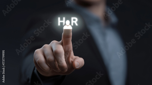 Businessman Touching Virtual HR Icon for Human Resources Management, Employee Engagement, Recruitment Strategy and Workforce Development