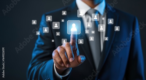 Businessman Touching Virtual Human Resources Interface: Recruitment, Networking, and Digital Transformation Concept on Dark Background